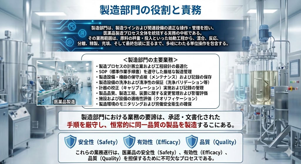役割: 製造プロセス全体を規定し、詳細な手順や指示を定義する「マスター文書」。製品ごと、工程ごとに作成が必須である。 内容: 原料の投入から混合、反応、分離、精製、充填、包装に至るまで、全工程の具体的かつ厳密な操作手順、および管理基準が含まれる。 詳細性: バッチごとに遵守すべき操作手順、製品仕様、品質基準などが詳細に定義されており、製造の絶対的な基準となる。 |