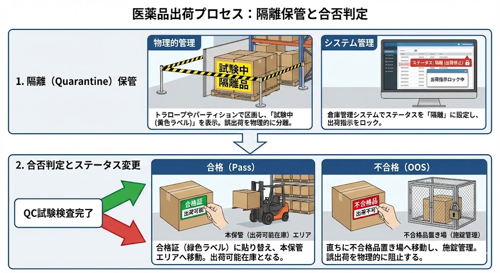 万が一、OOS(規格外)が発生した場合は、直ちに「不合格品置き場」へ移動させ、施錠管理するなどして、誤出荷を物理的に阻止する措置を講じる。
