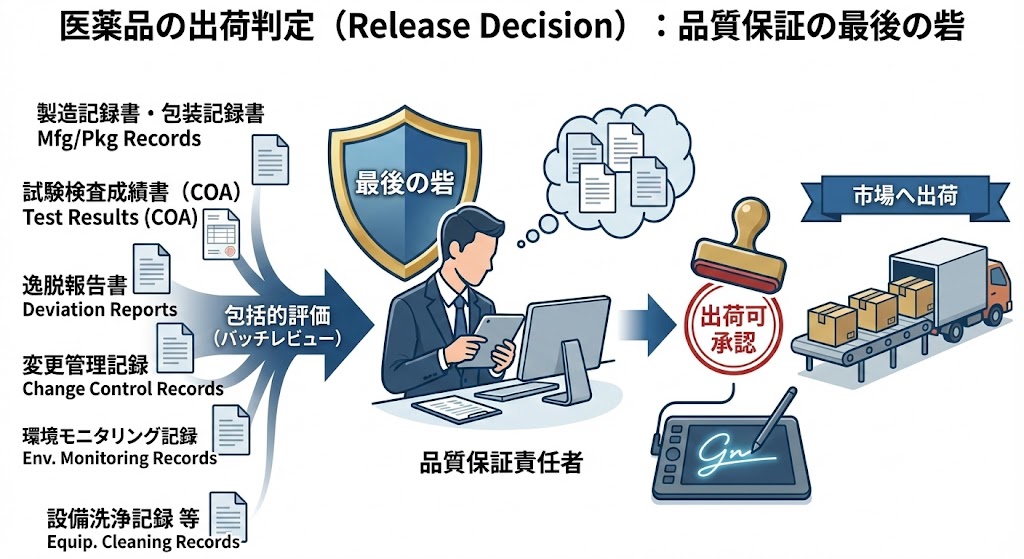 QA(品質保証部)は、単に試験結果だけでなく、製造プロセス全体が適正であったかを包括的に評価する(バッチレビュー)。
