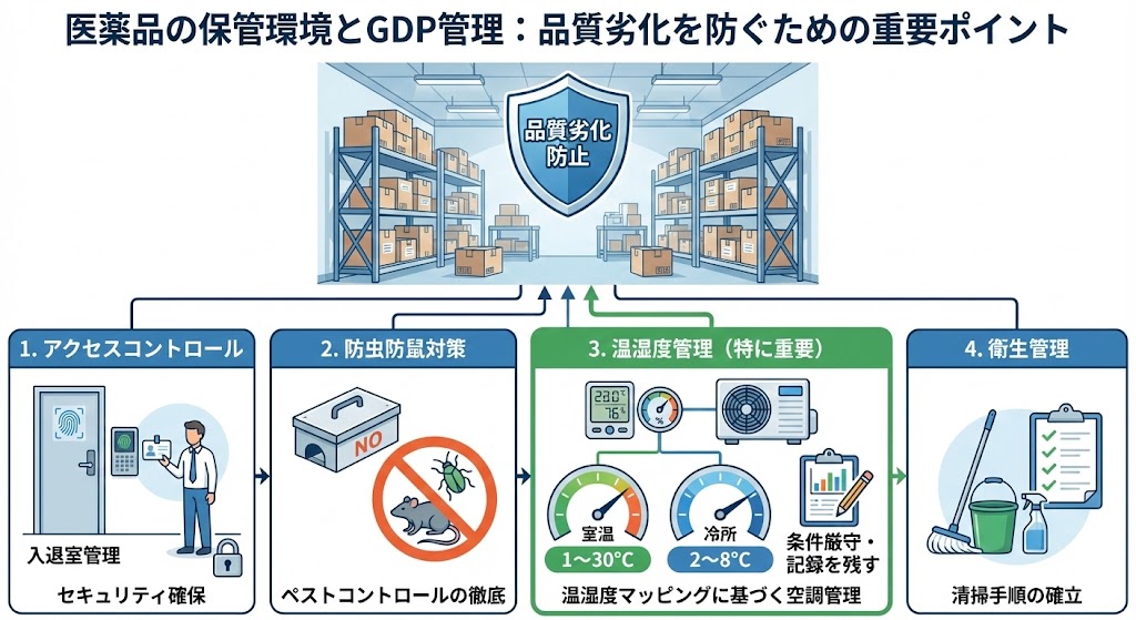 特に温度管理に関しては、安定性試験の結果に基づき「室温(1〜30℃)」「冷所(2〜8℃)」などの条件を厳守し、記録を残す必要がある。