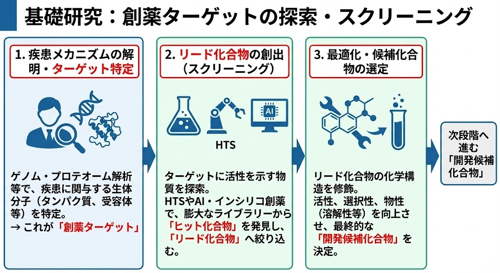 Aリード化合物の創出(スクリーニング) 特定されたターゲットに対して活性を示す物質を探索する。ハイスループットスクリーニング(HTS)やAIを用いたインシリコ創薬(コンピューターシミュレーション)を駆使し、膨大な化合物ライブラリーから「ヒット化合物」を見つけ出し、さらに最適化して「リード化合物」へと絞り込む。