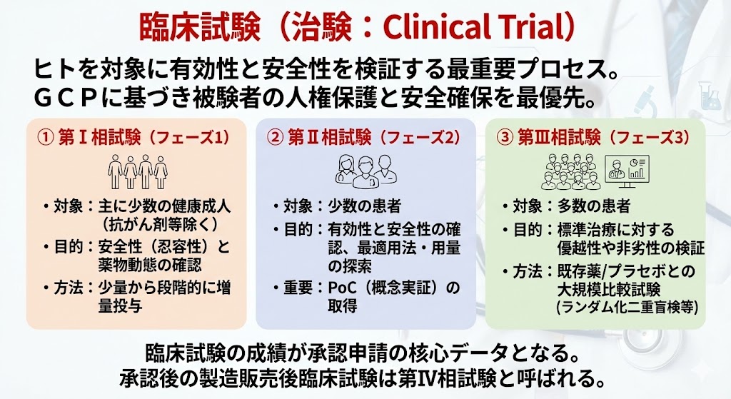 ヒト(健康成人および患者)を対象に、有効性と安全性を検証する最重要プロセスである。GCP(Good Clinical Practice:医薬品の臨床試験の実施の基準)に基づき、被験者の人権保護と安全確保を最優先に実施される。