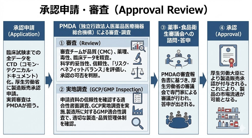 臨床試験までの全データをCTD(コモン・テクニカル・ドキュメント)としてまとめ、厚生労働省に製造販売承認申請を行う。実質的な審査はPMDA(独立行政法人医薬品医療機器総合機構)が担う。