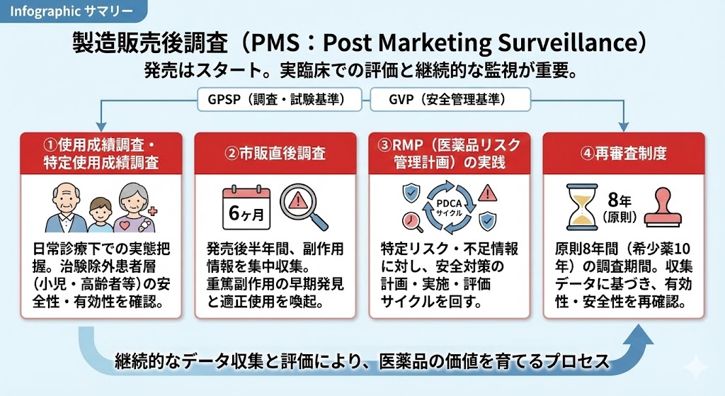発売はゴールではなく、実臨床での評価のスタートである。治験では得られなかった情報を収集するため、GPSP(製造販売後の調査及び試験の実施の基準)およびGVP(製造販売後安全管理の基準)に基づき、継続的な監視が行われる。