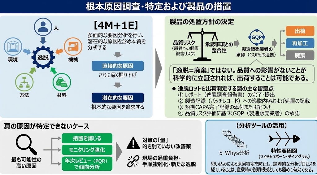 この場合は、最も可能性の高い原因(Most Probable Cause)を特定し、それを取り除く措置を講じる。その上で、再発の有無を確認するためにモニタリングを強化し、年次レビュー(PQR:製品品質照査)等の機会を用いて傾向分析を行う必要がある。
