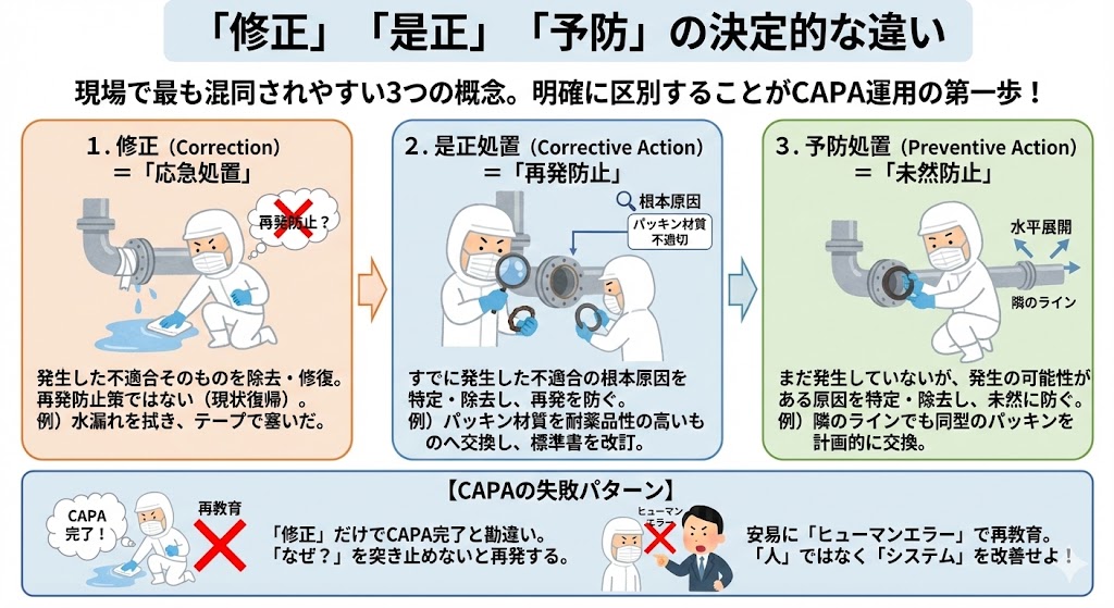 現場で最も混同されやすいのが、これら3つの概念である。これらを明確に区別することが、CAPA運用の第一歩である。