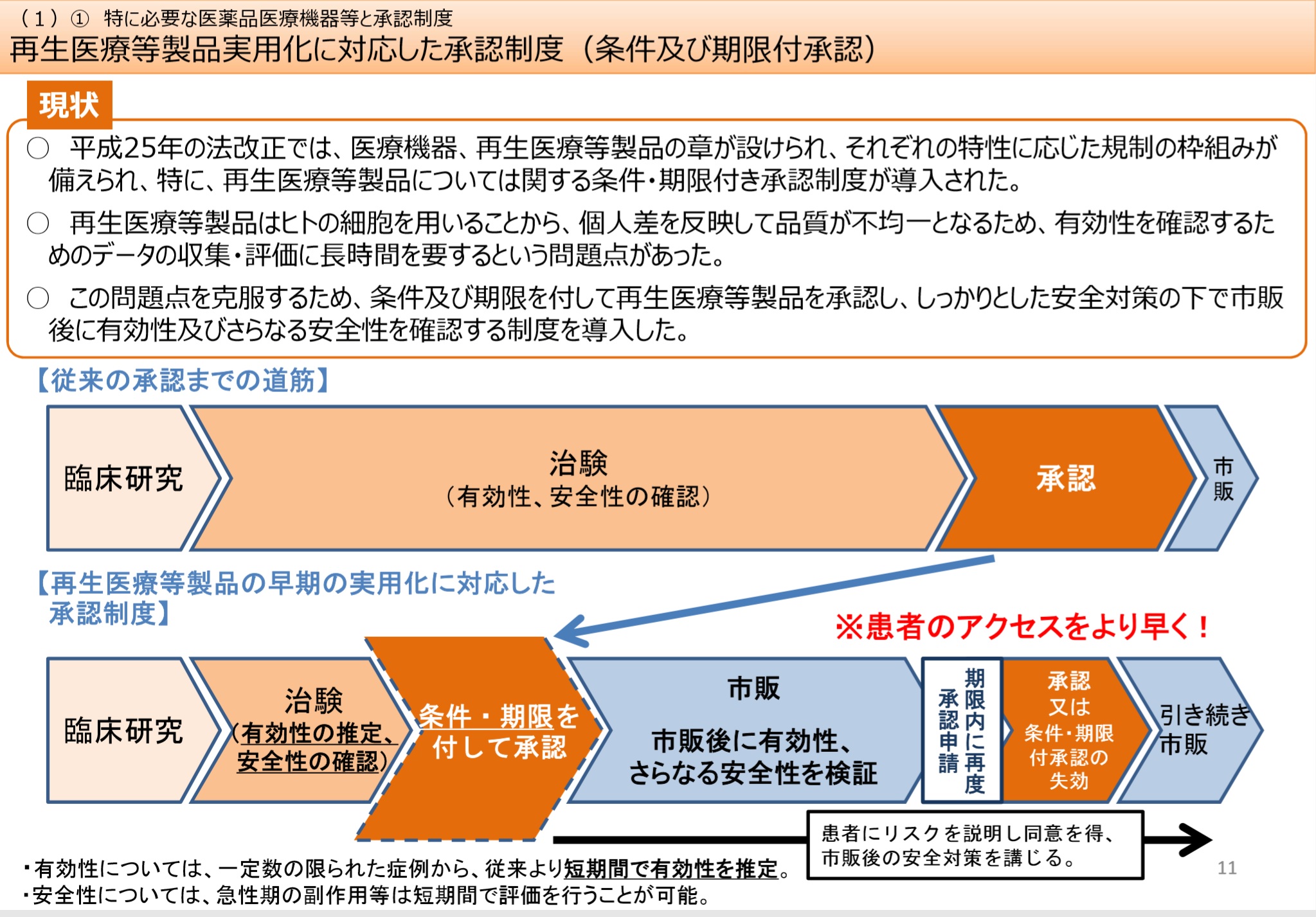 ・厚生労働省の通知に基づいて運用されている「先駆け審査指定制度」、「条件付き早期承認制度」を法律に基づく制度とする。
