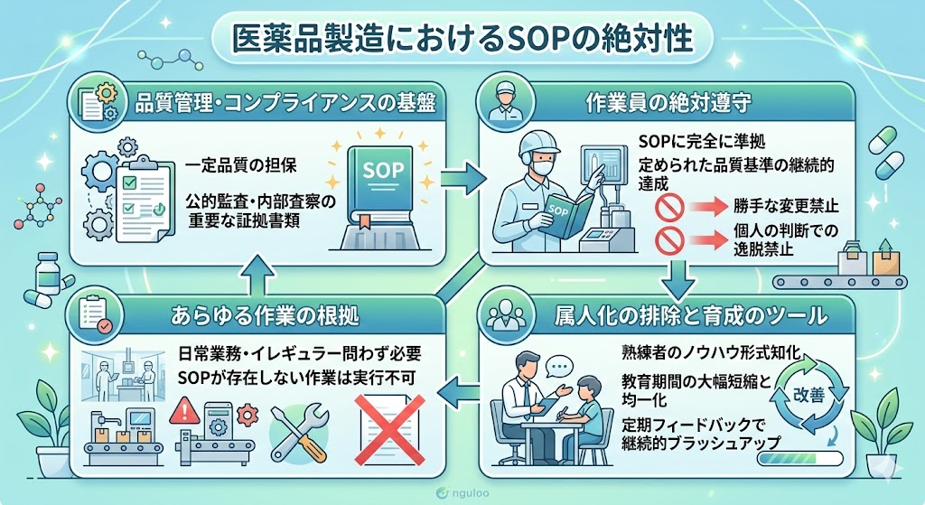 SOPは医薬品製造における品質管理および品質保証の基盤として位置づけられ、一定の品質を担保し、公的な査察や内部監査に備えるための重要な証拠書類となる。