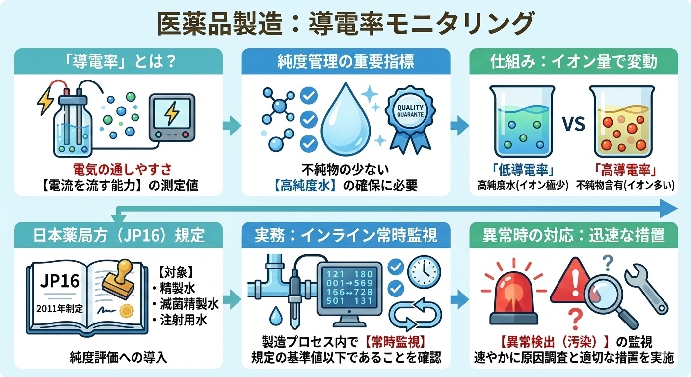 医薬品製造において、プロセスや原材料として使用される水には不純物の極めて少ない高純度水が求められる。その純度管理の重要指標として用いられるのが導電率である。