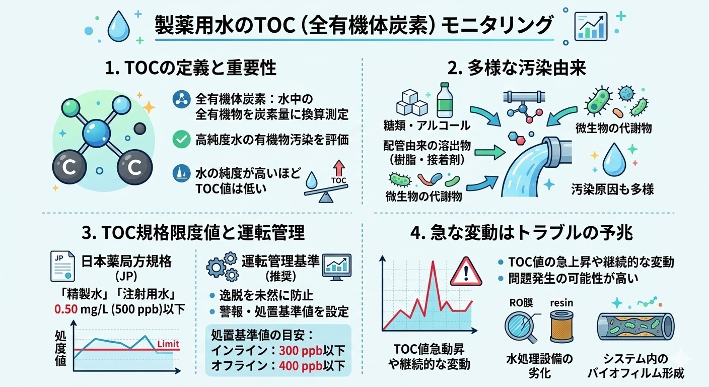 日本薬局方において、「精製水」および「注射用水」のTOC規格限度値はいずれも「0.50 mg/L(500 ppb)以下」と規定されている。しかし、実際の製薬用水システムの運転管理においては、規格外れ(逸脱)を未然に防ぐため、施設ごとに厳しい警報基準値(アラートレベル)と処置基準値(アクションレベル)を定めてモニタリングすることが強く推奨される。