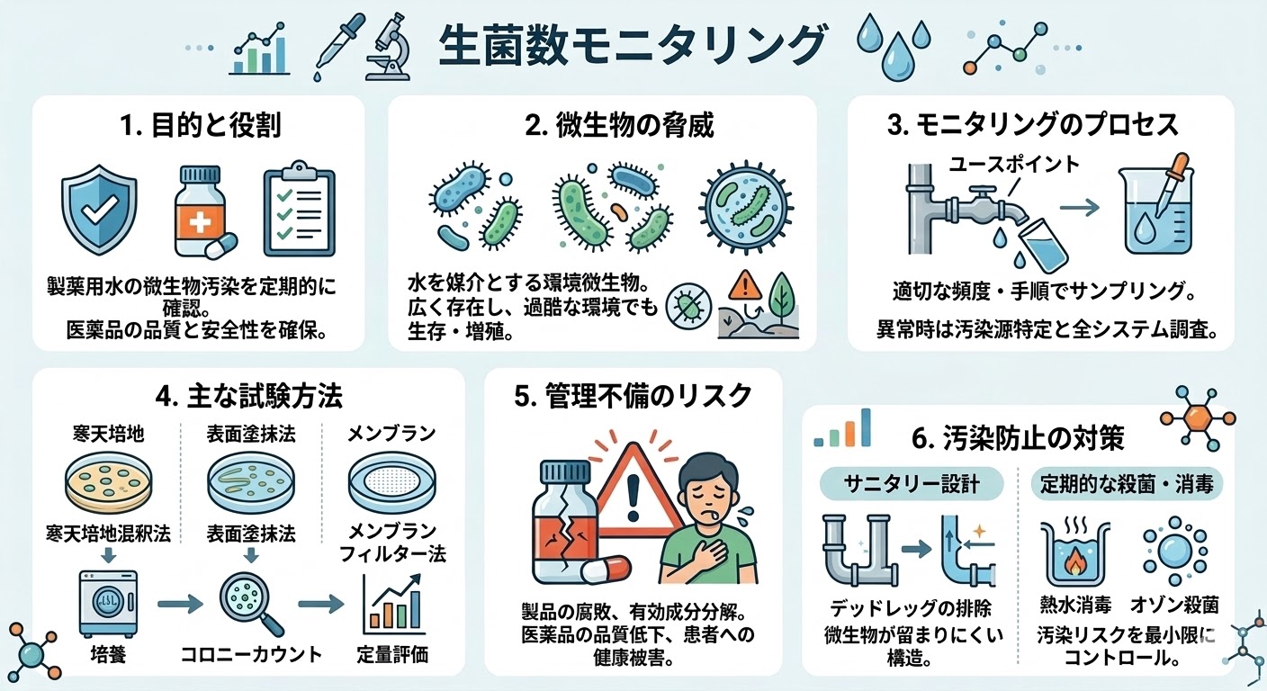 生菌数モニタリングの主な目的は、製薬用水が微生物によって汚染されていないことを定期的に確認し、医薬品の品質と安全性を確保することである。