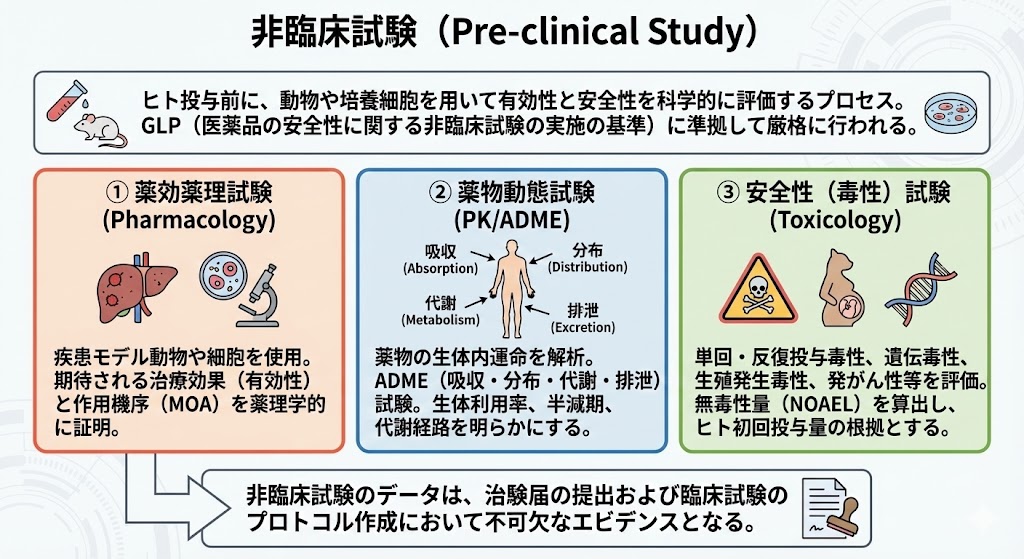 ヒトに投与する前に、動物や培養細胞を用いて有効性と安全性を科学的に評価するプロセスである。この段階の安全性試験は、GLP(Good Laboratory Practice:医薬品の安全性に関する非臨床試験の実施の基準)に準拠して厳格に行われる。
