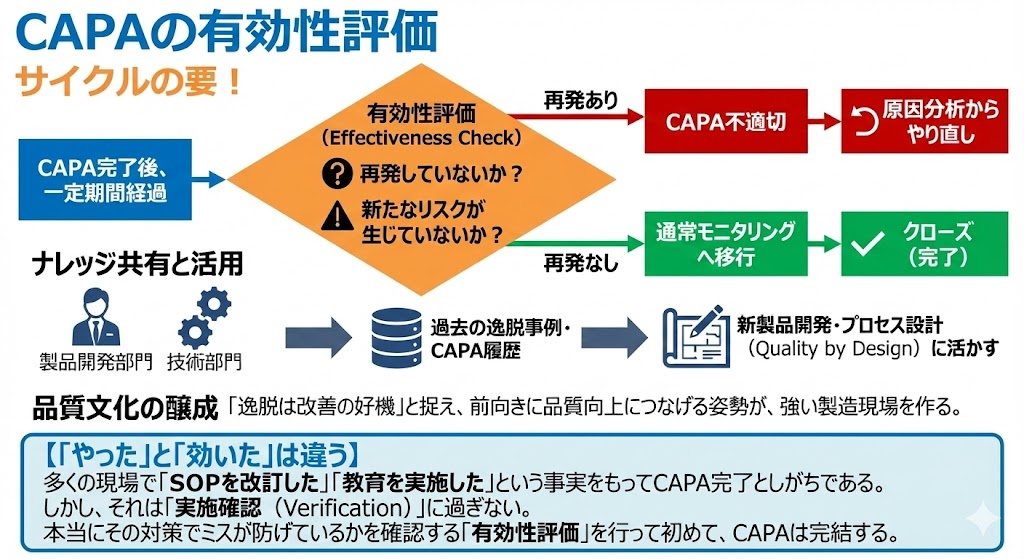 CAPA完了後、一定期間を経て「再発していないか」「新たなリスクが生じていないか」を確認する。CAPAの有効性評価(Effectiveness Check)こそが、サイクルの要である。