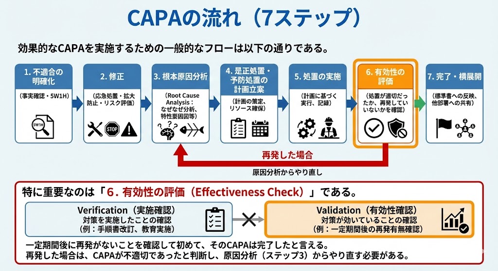 特に重要なのは「6.有効性の評価(Effectiveness Check)」である。「対策を実施したこと(Verification)」と「対策が効いていること(Validation)」は別物である。一定期間後に再発がないことを確認して初めて、そのCAPAは完了したと言える。再発した場合は、CAPAが不適切であったと判断し、原因分析(ステップ3)からやり直す必要がある。