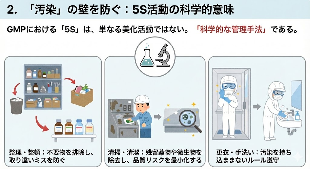GMPにおける「5S(整理・整頓・清潔・清掃・躾)」は、単なる美化活動ではない。