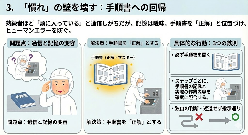 思い込みによるミス(ヒューマンエラー)を防ぐため、常に目の前の手順書を「正解(マスター)」と位置づける必要がある。