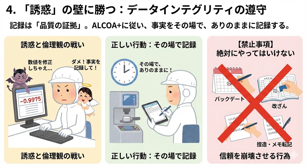 製造担当者には、記録をALCOA+の原則に従い、誠実に行う高い倫理観が不可欠である。
