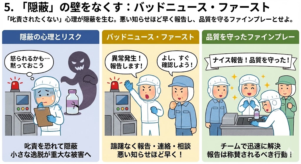 異常や逸脱を発見した際の報告は、非難されるべきことではなく、品質を守ったファインプレーとして評価されるべき行動である。